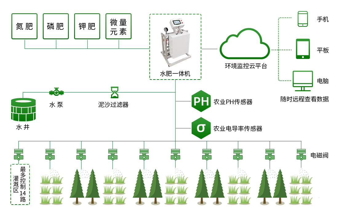 智能水肥一體化系統(tǒng):與傳統(tǒng)的灌溉方法相比,仁科水肥一體化智能灌溉系統(tǒng)采用傳感器、物聯(lián)網(wǎng)、云計算等多項技術(shù),集灌溉和施肥于一體,由水肥一體機、土壤墑情采集終端(土壤溫度水分電導(dǎo)率三合一變送器、土壤氮磷鉀變送器、土壤PH變送器)、過濾系統(tǒng)、閥門控制器、電磁閥、田間管路、監(jiān)控軟件云平臺組成,具有節(jié)水節(jié)肥、節(jié)省人力的特點。